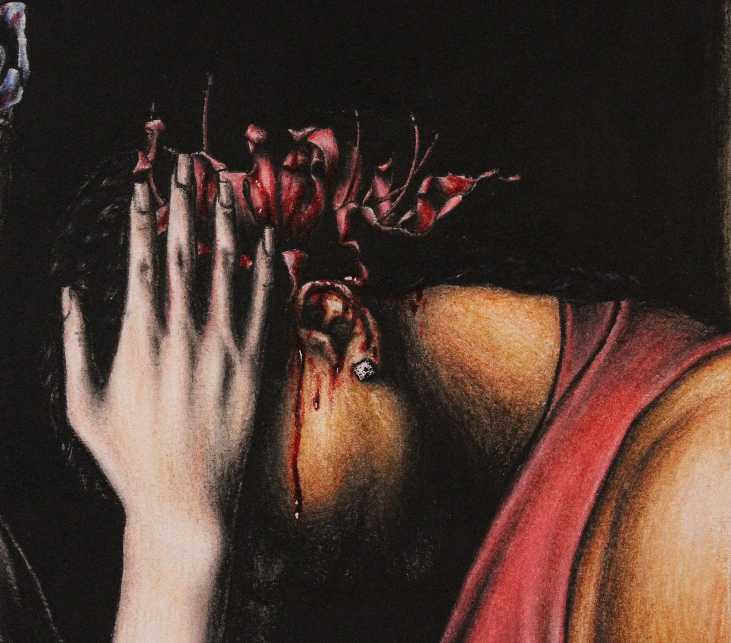 My piece titled, “Deceased Flowers” is 14 x 17 inches and made from charcoal and pastels on heavy-weight paper. This piece is an illustration of a woman who is gently holding a man’s head close to her as his head is facing straight down in a depressing manner. The woman in this piece is Hispanic with pale skin and red undertones. She has short dark brown hair that appears almost black and rests just below her ear that is pierced with a gold hoop earring, she is also wearing a black T-shirt that compliments her hair and the black background. This piece showcases the woman’s side profile but her head is in a 3/4ths position with her gaze facing towards the audience. In the center of her forehead, just above her eyes, are light blue flower peddles blooming from the hole that is in her head. The flower peddles act as a part of her flesh and disguises itself as the tissue beneath the skin as they are stained in blood. The man that she is holding is black with red undertones and has long hair that is styled in cornrows. He as a similar hole just like the woman in front of him, but his is placed in the back of his head and is much larger. Red flower peddles bloom in contrast to the blue flower peddles. However, there is far more blood gushing out from the man which indicates that the wound is still fresh.