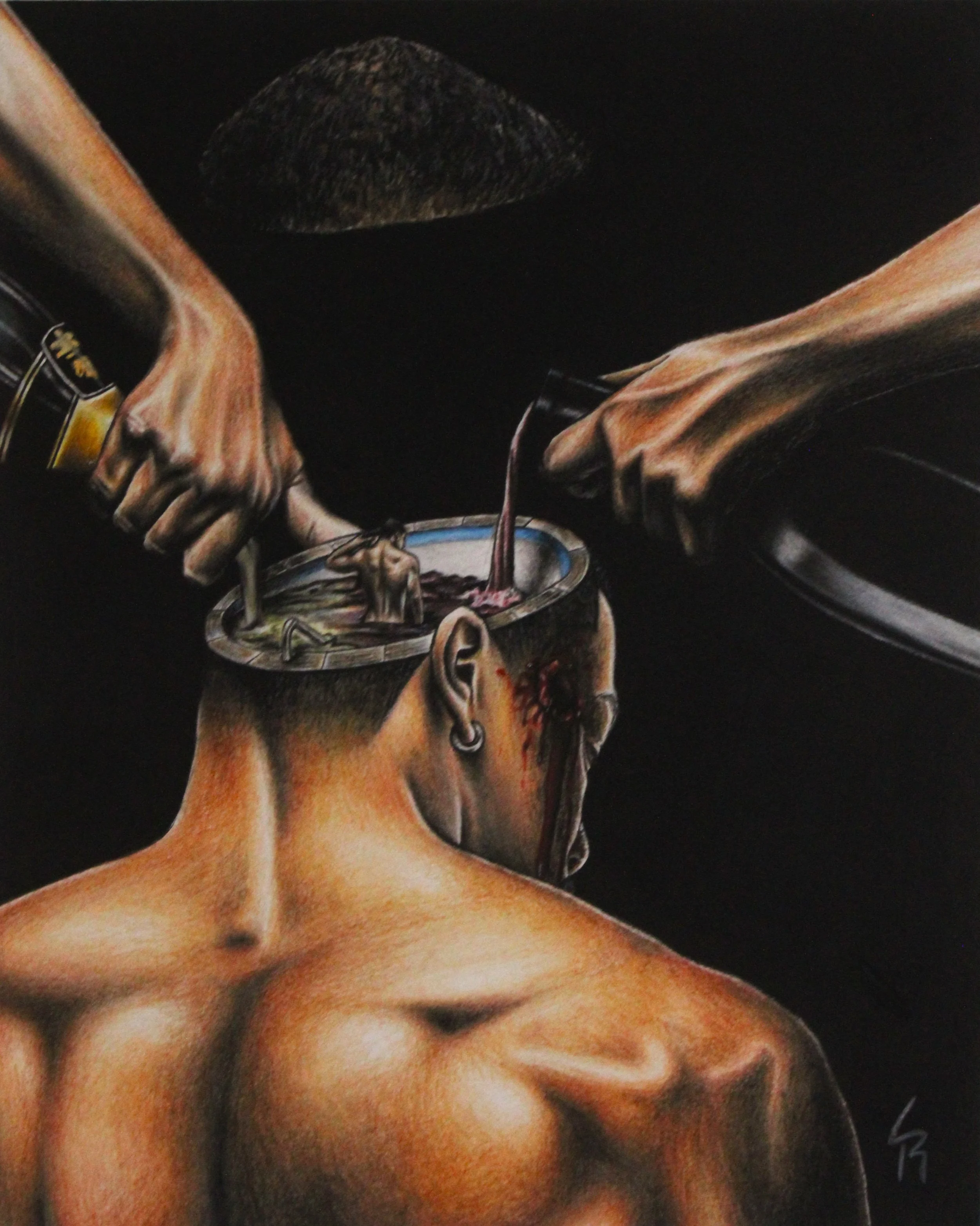 “Swimming Pools Filled With Liquor”, was inspired by the song, “Swimming Pools” by Kendrick Lamar. This is a 14 x 17 inch piece made from charcoal and pastels on heavy-weight paper. This piece shows an image of a man with his back faced toward the viewer with his head slightly turned to his right shoulder. The man’s head is cut opened from the front of his hairline to the occipital bone. Part of his head is floating above him while the inside of his skull displays a swimming pool. In the center of this pool is a miniature version of himself in the same position as his larger self but he is holding a gun to his head. To the left and the right side of the larger version of this man are two arms stretched out above him pouring bottles of alcohol into the swimming pool. This piece shows light and dark liquor being mixed together at a fast pace. The large version of himself also has a bullet wound on the right side of his face. All of this is being displayed in front of a plain black background.